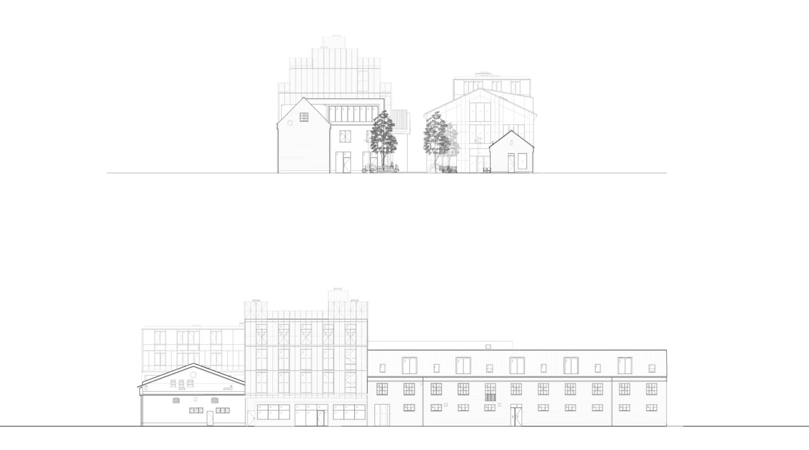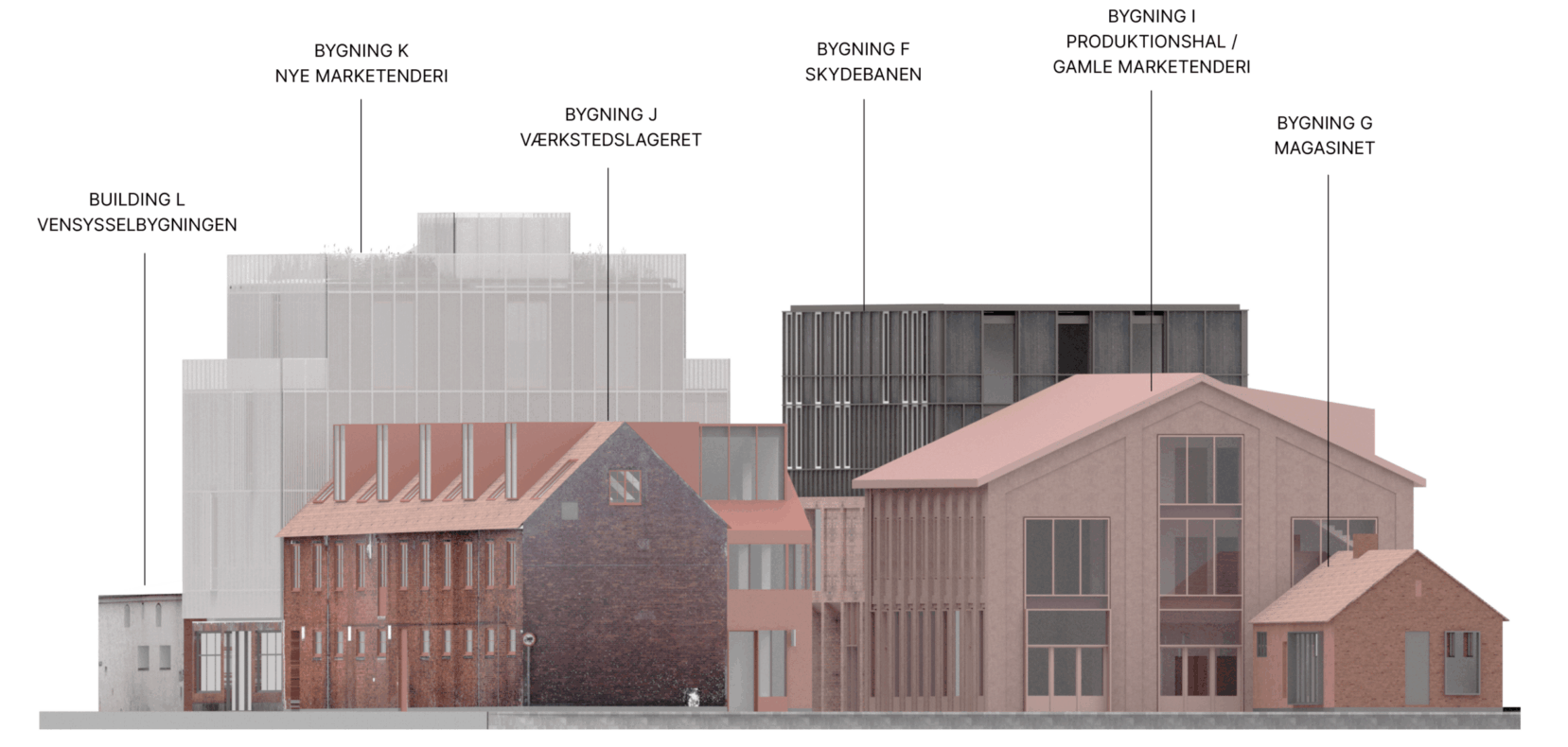 The project incorporates transforming three of these buildings, creating two additional building volumes and an add-on on top of an existing historical building. The aim of the architectural transformation is for the buildings to once again add great value to Nordhavn – now in a more contemporary context. The buildings are transformed with respect for their historical character and identity, and brought to life as restaurants, workshops and office spaces. The six buildings hint at their respective legacies through their design, materiality and future programming; Værkstedslageret, Nye Marketenderi, Produktionshallen, Skydebanen, Magasinet and the old cement storage building Vendsysselbygningen, which is the oldest building in Nordhavn dating back to 1895.